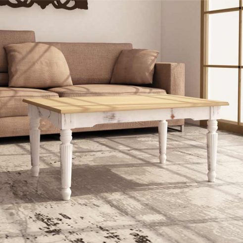 Mesa de centro provenzal fija y elevable de patas torneadas, fabricada en madera de pino.